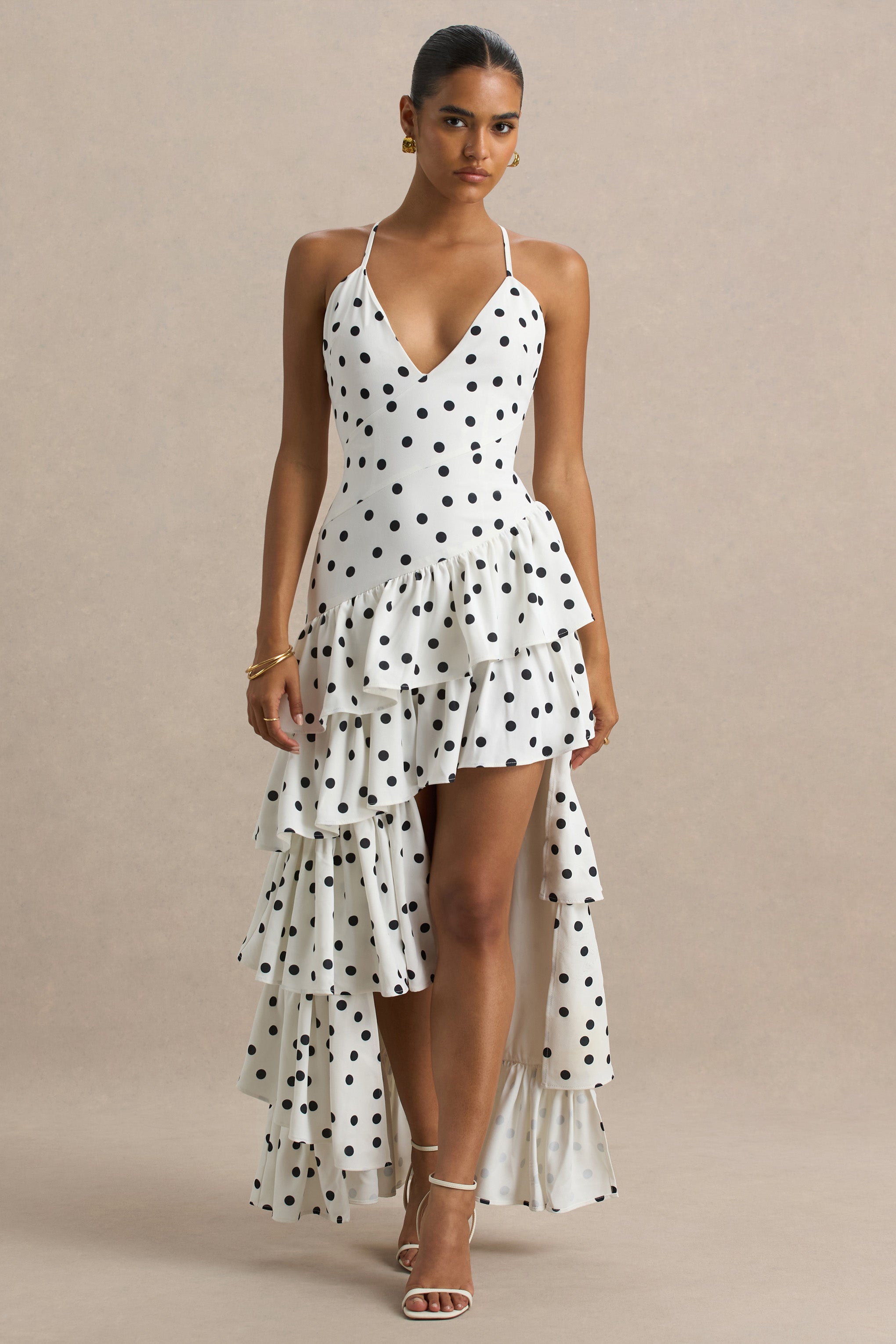 Bogota | Polka Dot Plunge-Neck Maxi Dress With Ruffling Details And Front High Split
