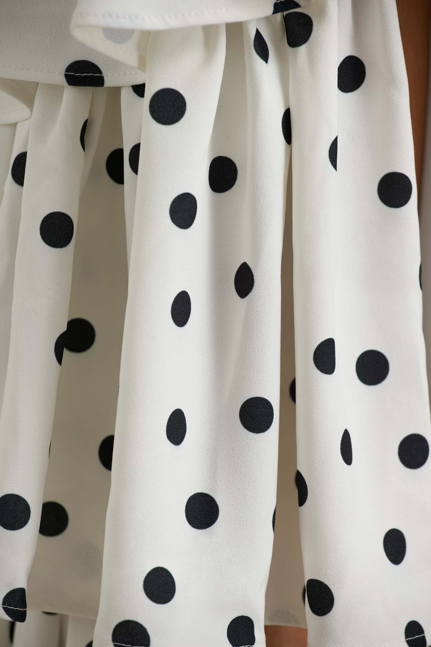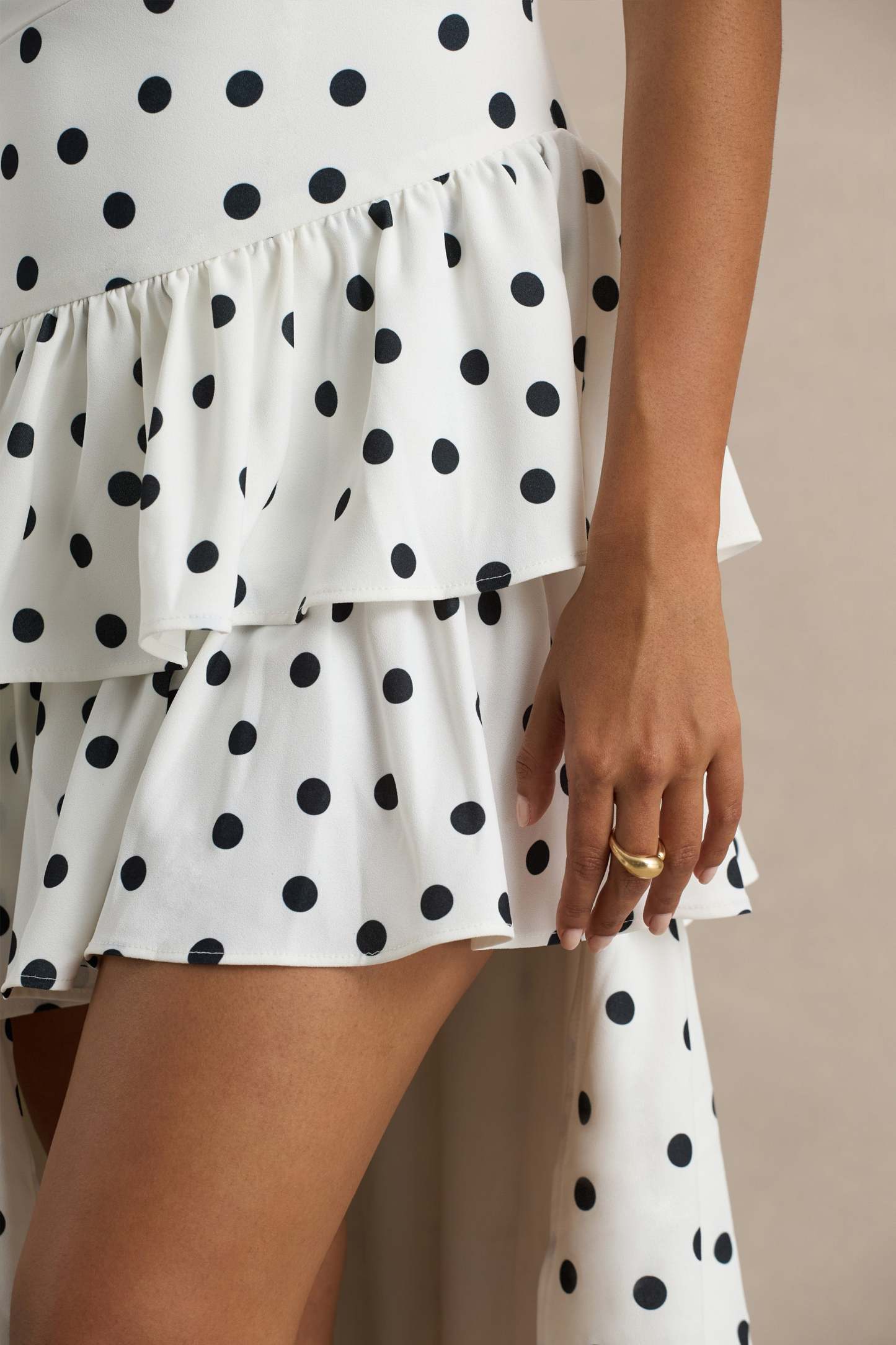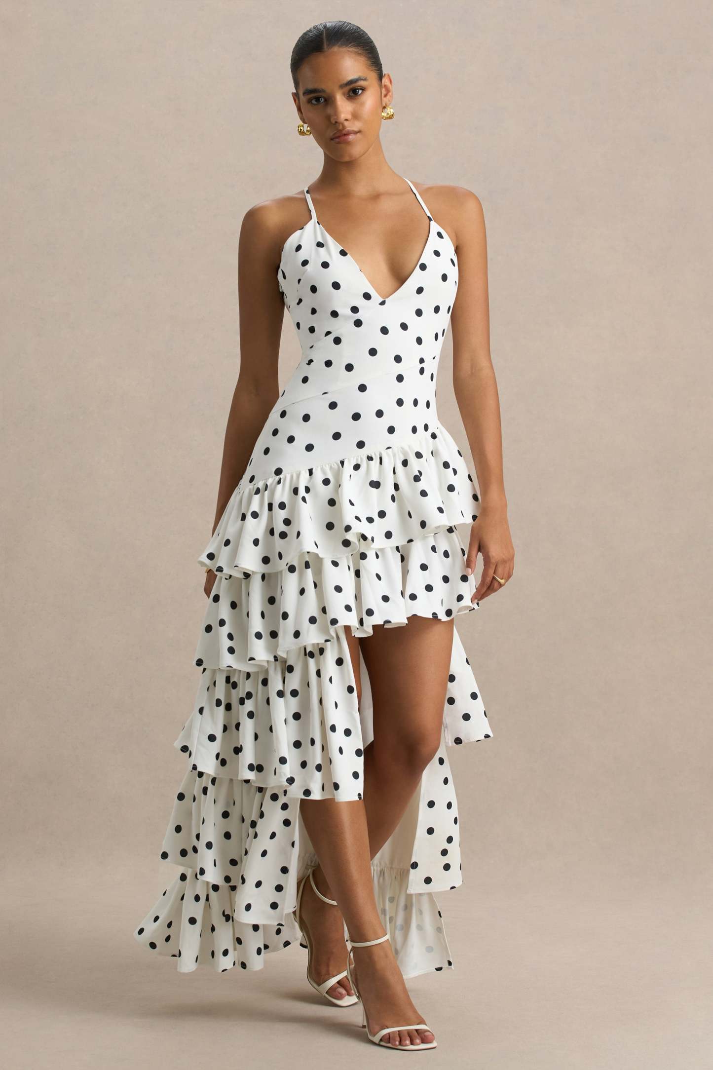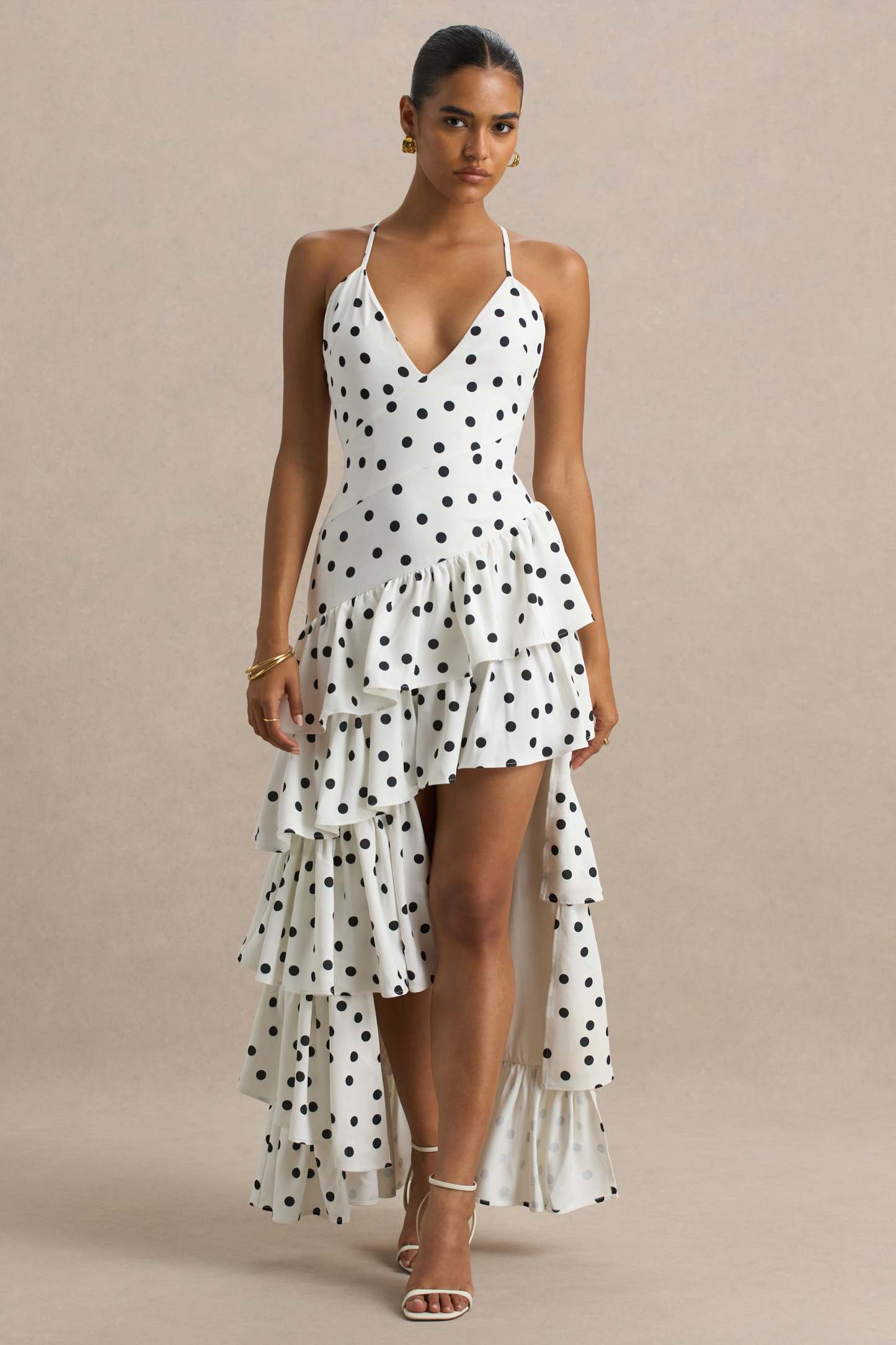 Turn heads from every angle in Bogota, a bold and playful take on timeless glamour. Cut from our premium polka dot crepe, this standout style features a plunging neckline and drop waist that flatters the silhouette while adding a touch of drama. Delicate crossover straps frame a deep V-shaped back, while a cascading layered-ruffled skirt moves effortlessly with every step. For moments that call for feminine elegance, Bogota is the perfect choice with strappy heels and dainty jewellery.