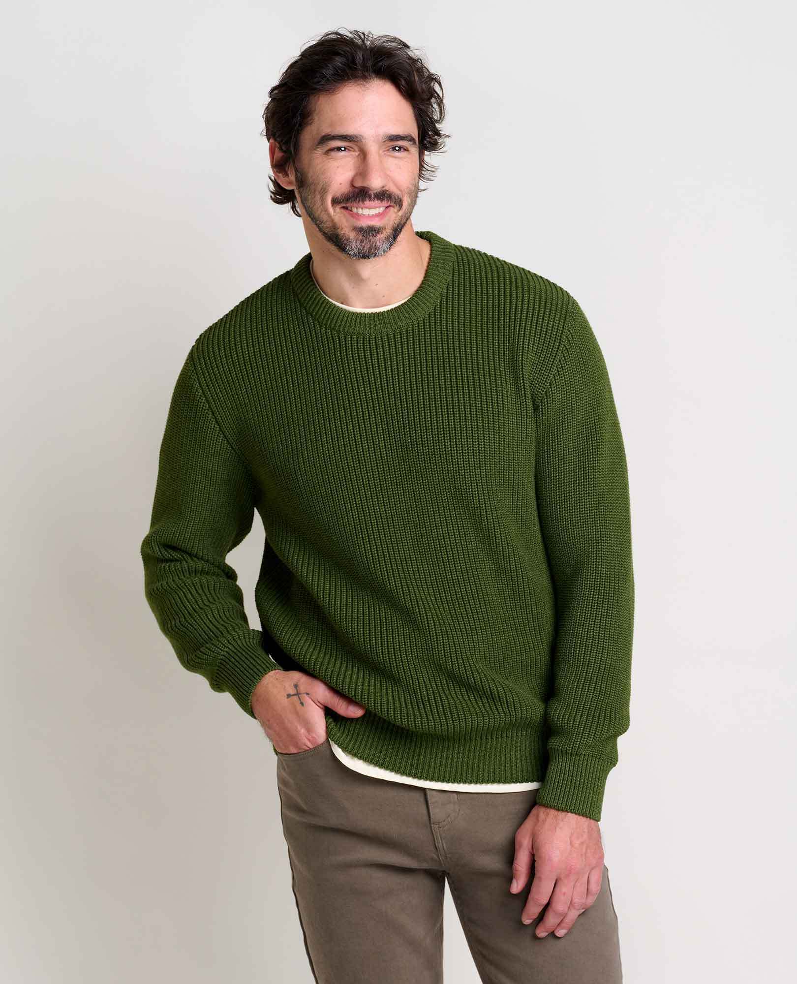 Made from 100% recycled materials, this easy-wearing sweater channels the time-tested quality of your grandpa’s favorite layer but with a softness that inspires cuddling.