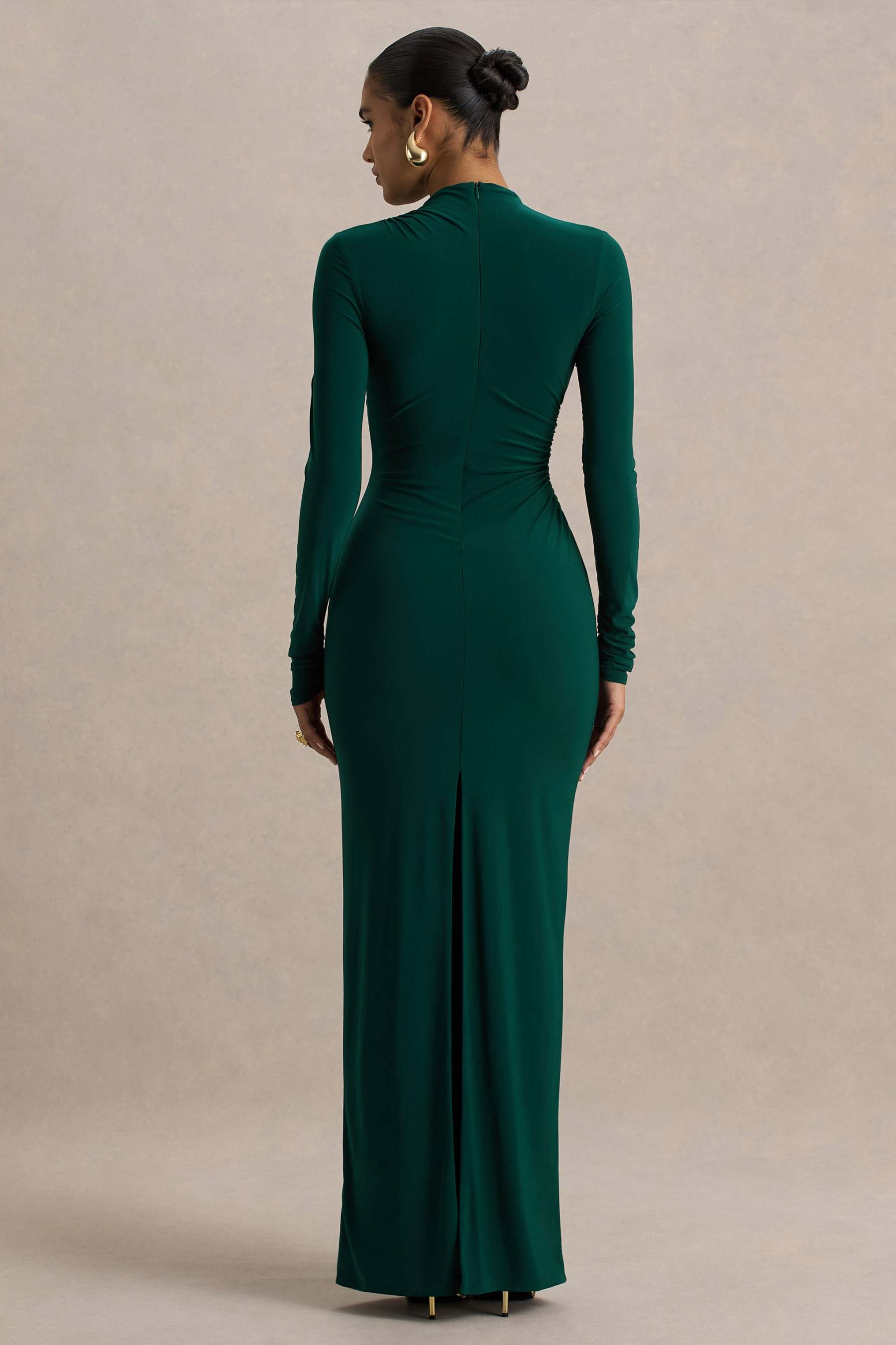 Elegant, refined, and endlessly flattering, Eden is the epitome of understated glamour. Crafted from our premium stretch jersey in a rich bottle green, this maxi dress is designed to sculpt and smooth, offering a flawless fit that enhances every curve. The high neckline adds a polished edge, while ruched and gathered detailing at the waist draws the silhouette inward for a beautifully cinched shape. A subtle centre-back split adds just the right amount of movement, making Eden a timeless choice for formal moments and elegant evenings.