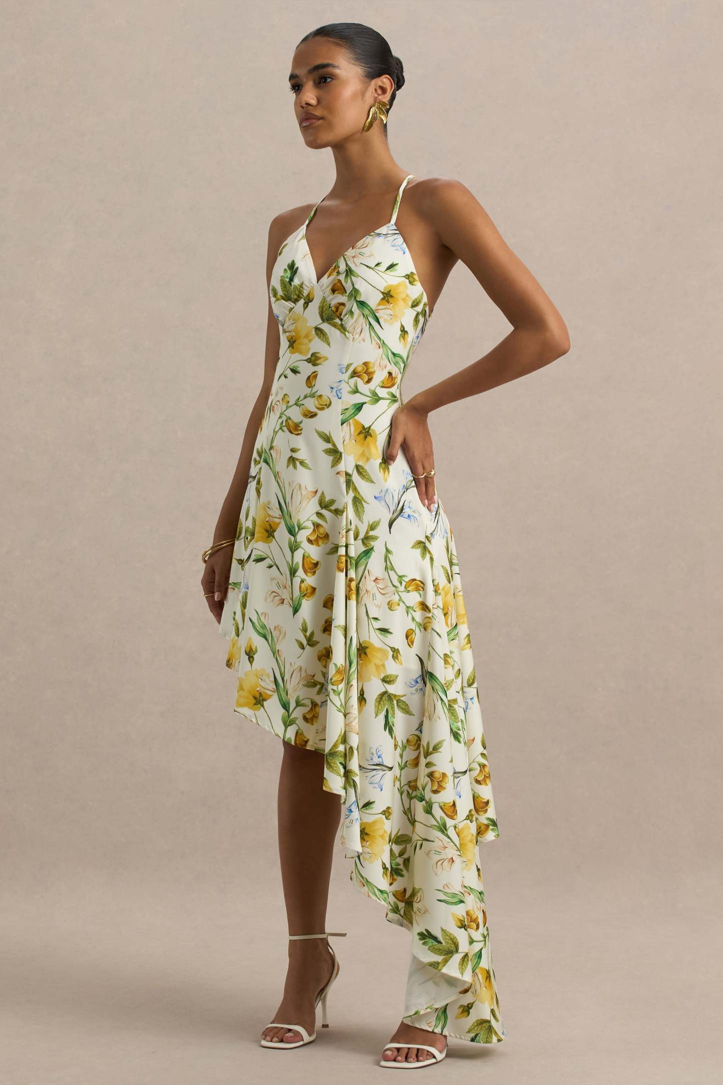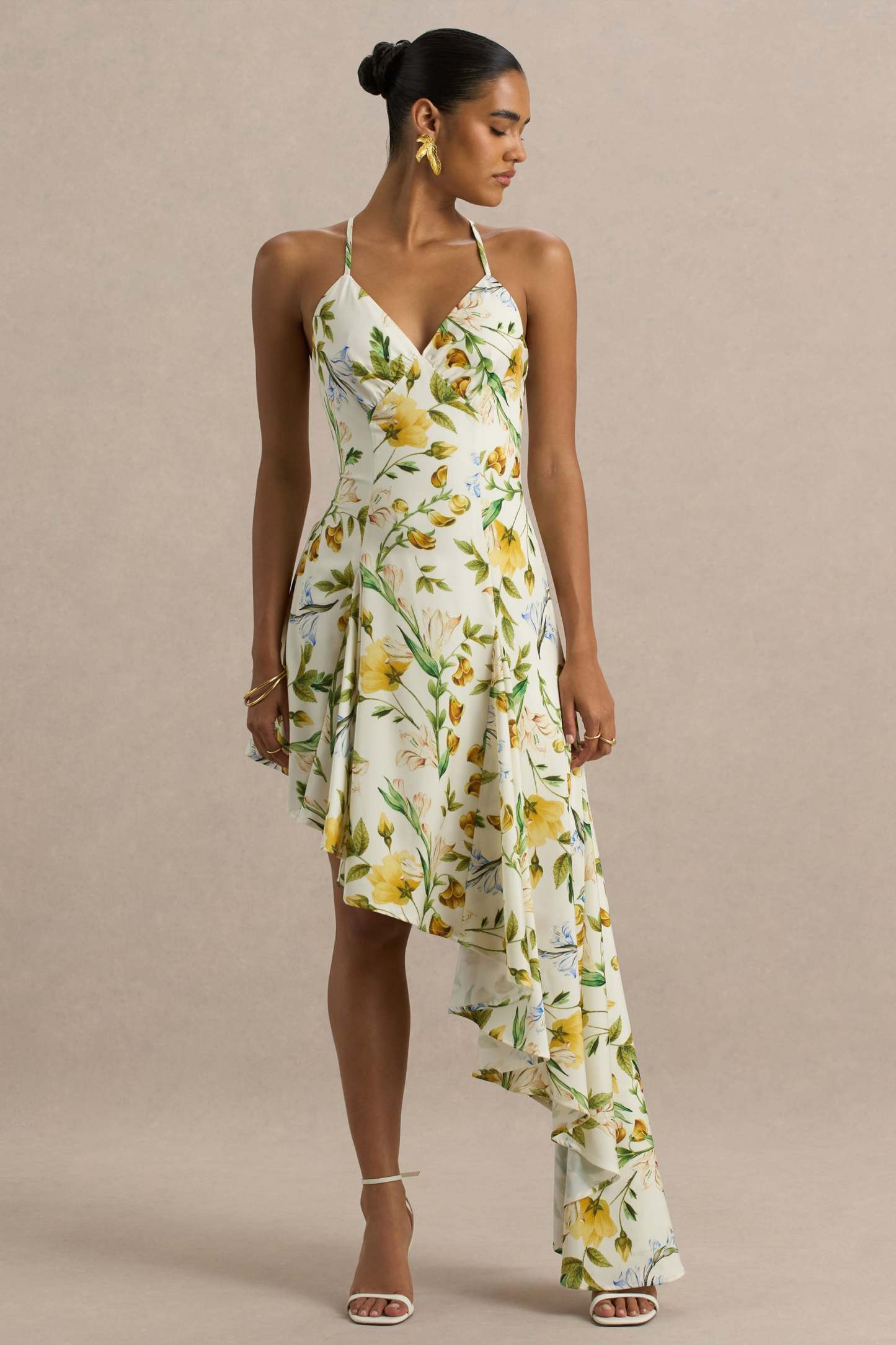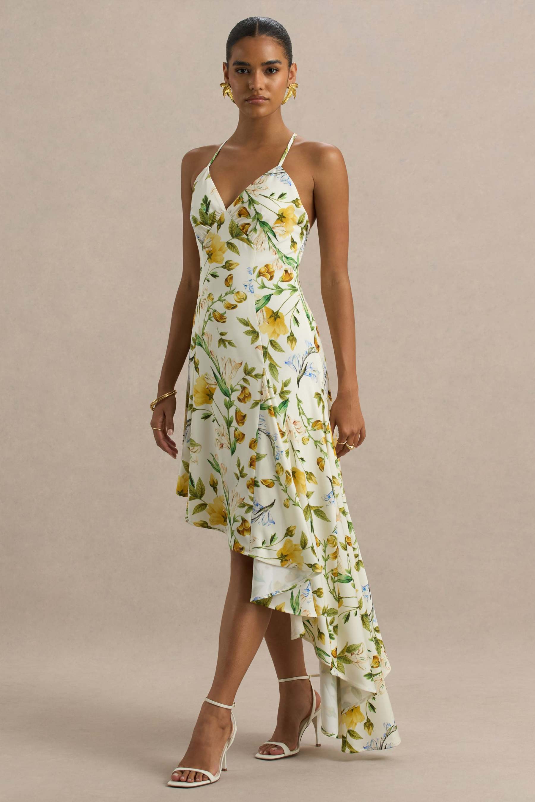 Step into the spotlight with Glint, your next statement-making showstopper. Cut from our premium stretch satin in a soft white botanical print, this maxi is designed to mesmerise. Featuring a daring plunge neckline and a flattering V-shaped back design, Glint gracefully drapes over your figure before cascading into a dramatic, ruffled, asymmetric hemline. This piece moves effortlessly and is perfect for upscale events that call for dancing. Style with dainty jewellery to complete the look.