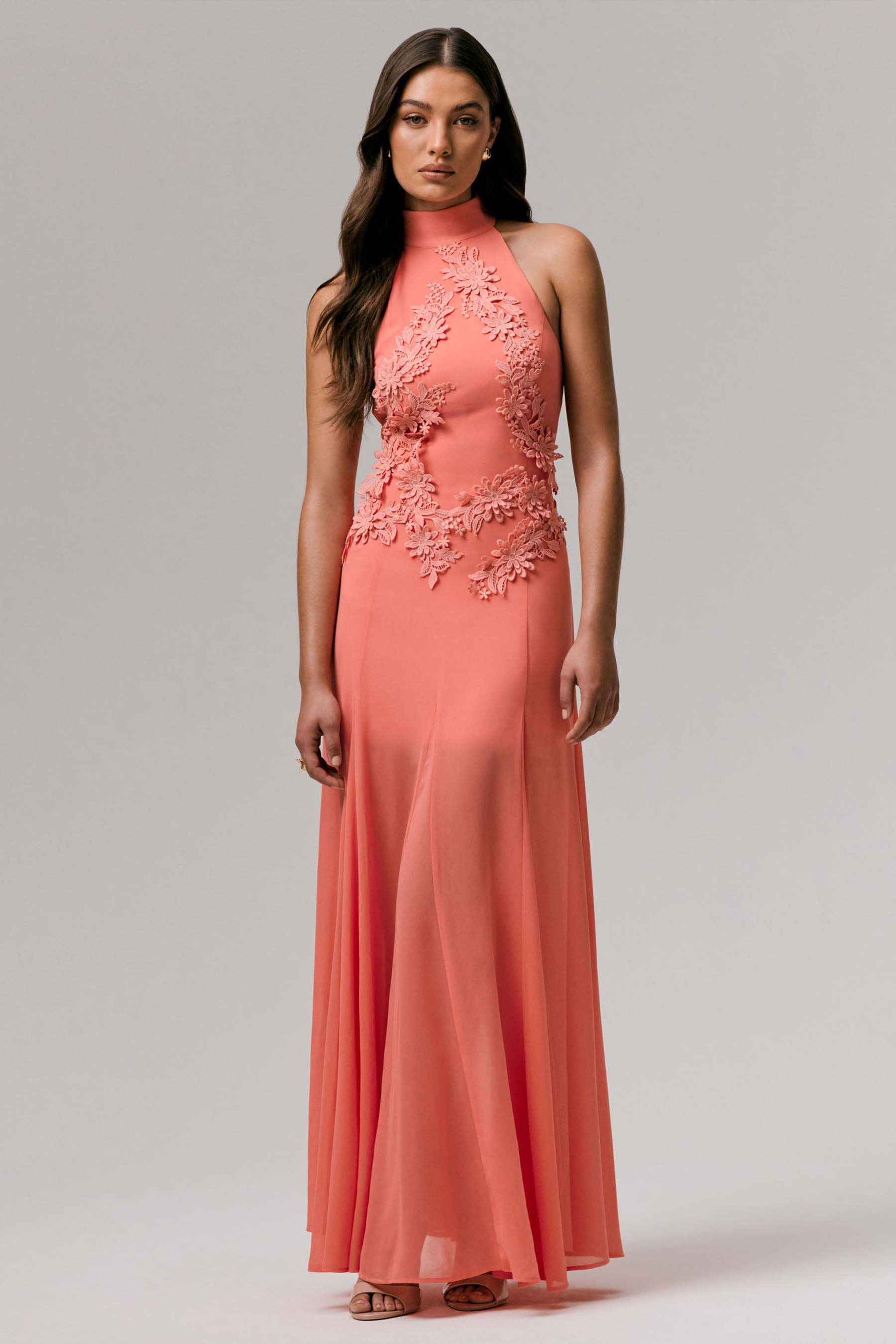 Turn heads with effortless elegance in our dress. Designed in our premium chiffon and finished in a vibrant coral shade, this maxi dress is made to impress. The high neckline and sleeveless cut offer a sleek, refined shape, while the lace applique adds just the right amount of drama. The fishtail silhouette sculpts your figure, flaring into a flowing godget hem for maximum impact.