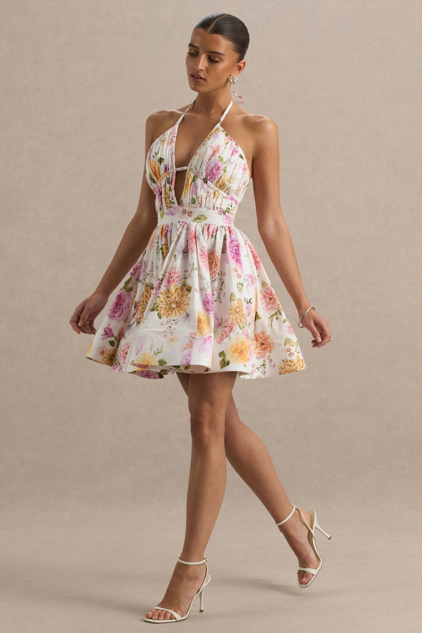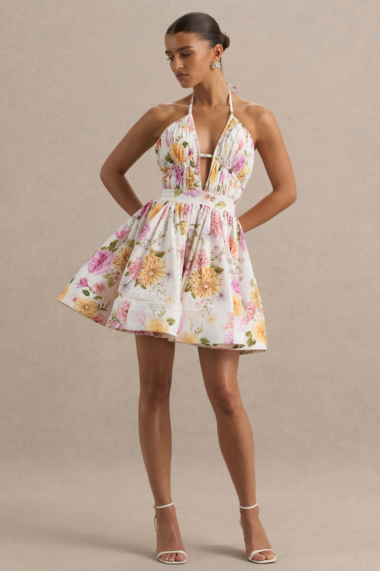 Flirty, playful and completely captivating, our Kasey dress has arrived. Crafted in a gorgeous cream floral print of our premium satin, this mini is equal parts bold and elegant. The daring plunge neckline is complimented by a delicate self-tie detail, for a romantic finish. Finished with a ruffled, voluminous skater skirt this dress brings drama and charm to any occasion. Kasey is the perfect piece for sun-soaked occasions this season, paired with strappy heels and a glamorous up-do.