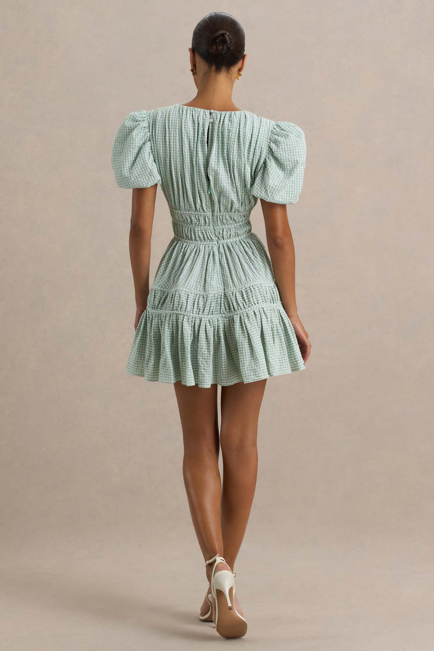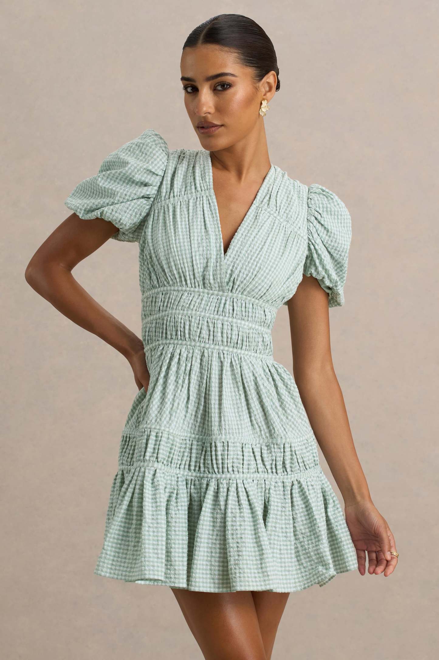 Summery chic and effortlessly feminine, Laurelle is your go-to mini for sunshine-soaked days. Cut from our premium green seersucker, this playful dress features an extreme plunge neckline that delicately frames the decolletage. The voluminous puff sleeves and tiered ruffled skirt bring a romantic charm, while the keyhole back detail adds a touch of refined elegance. Whether it’s brunch with the girls or a weekend escape, Laurelle is made to turn heads.