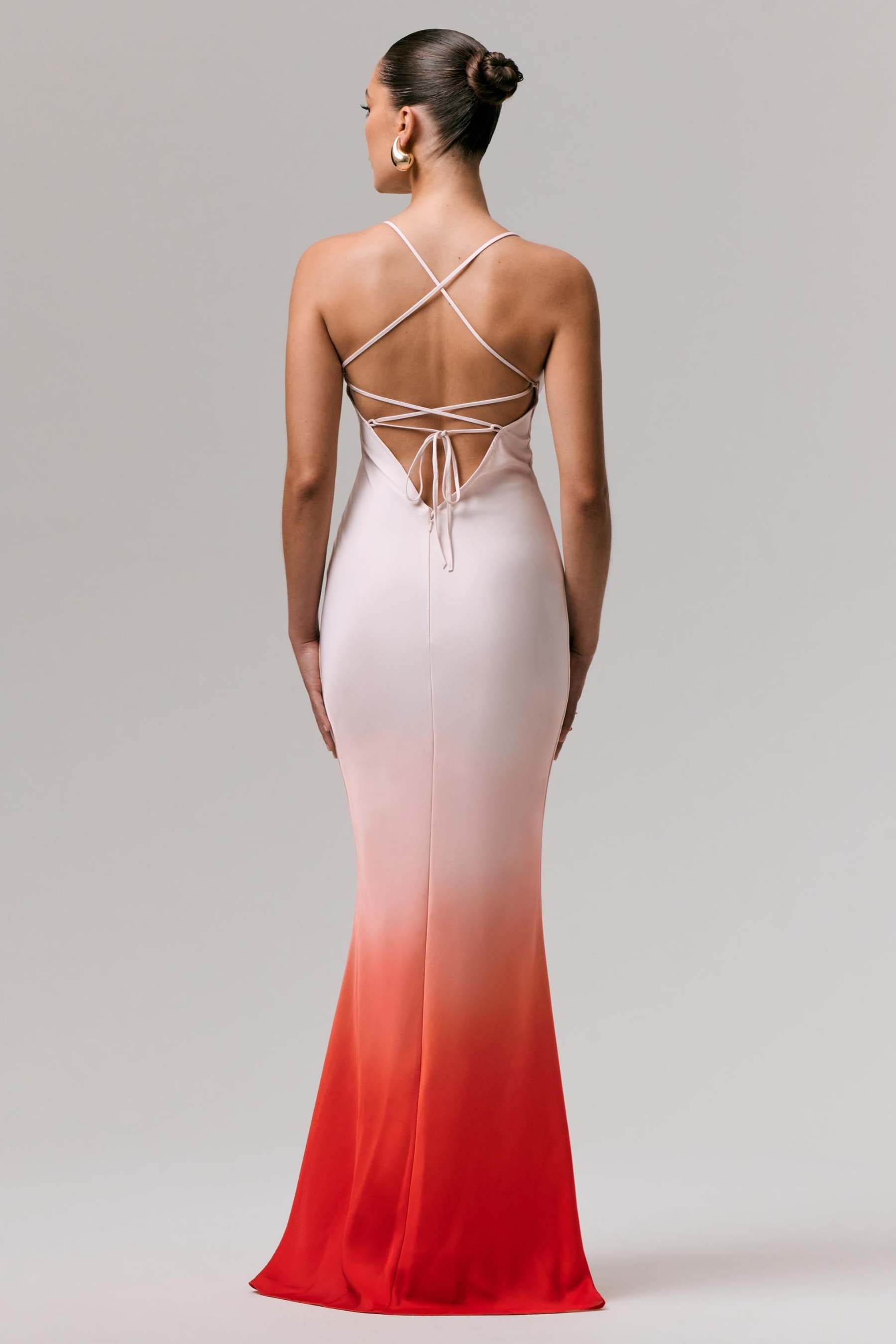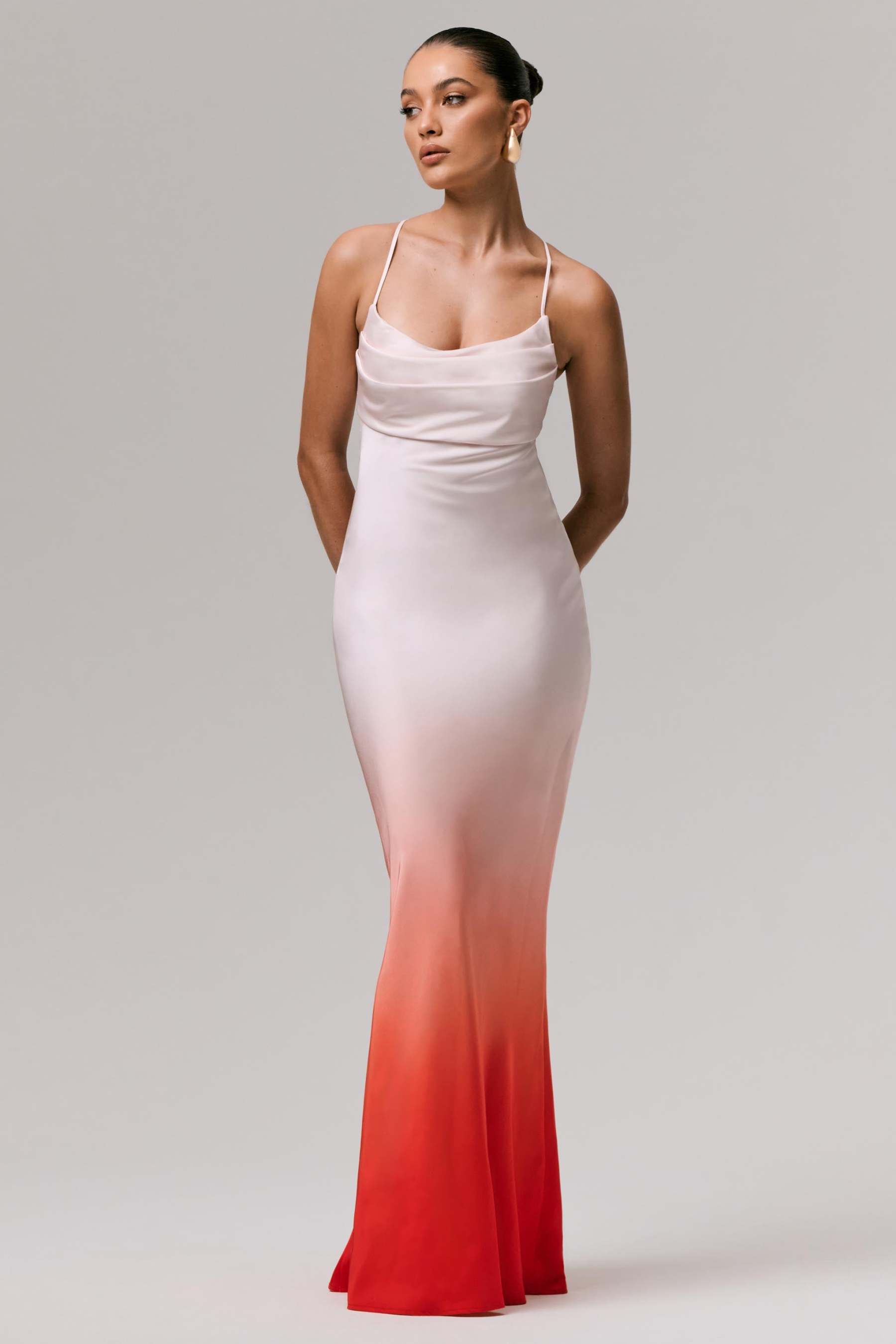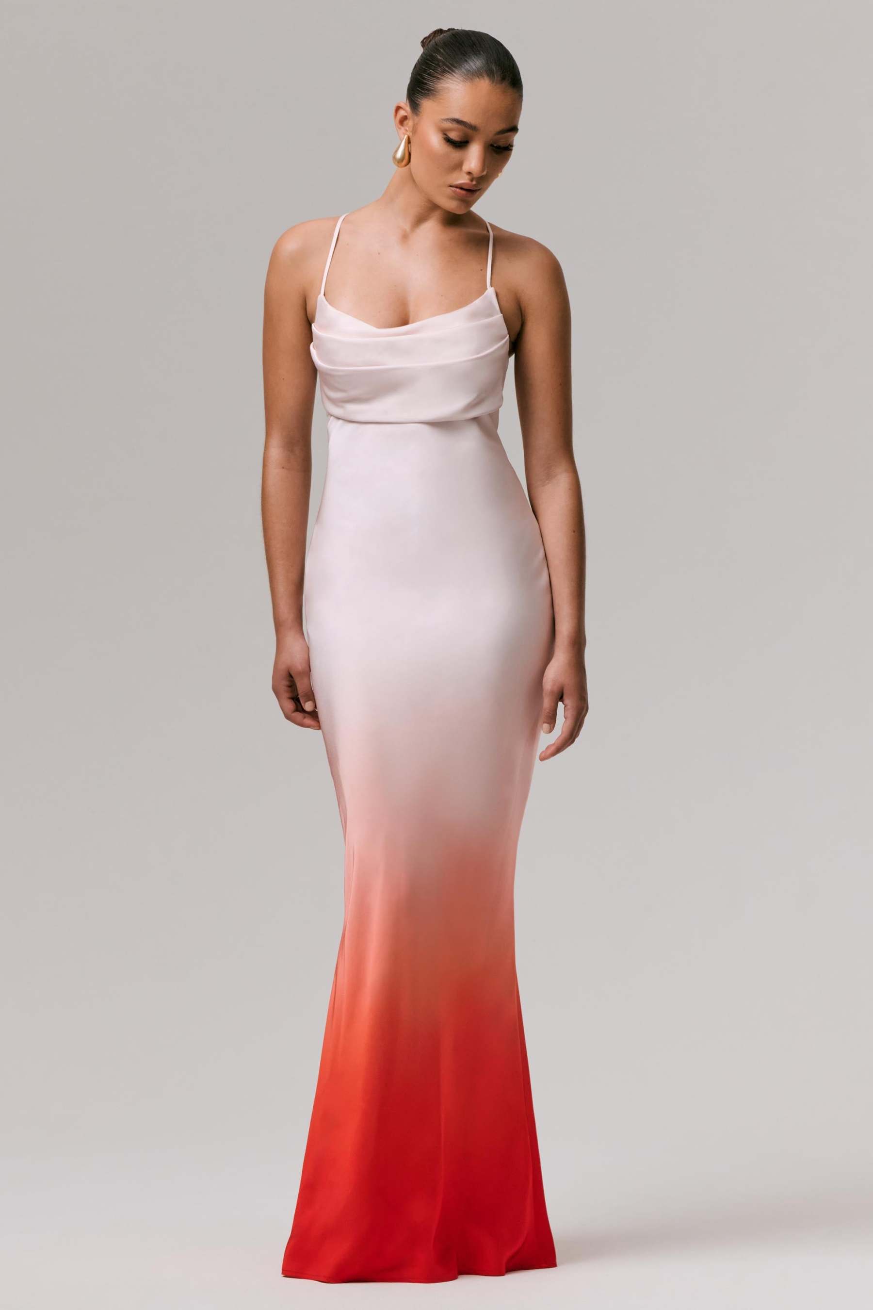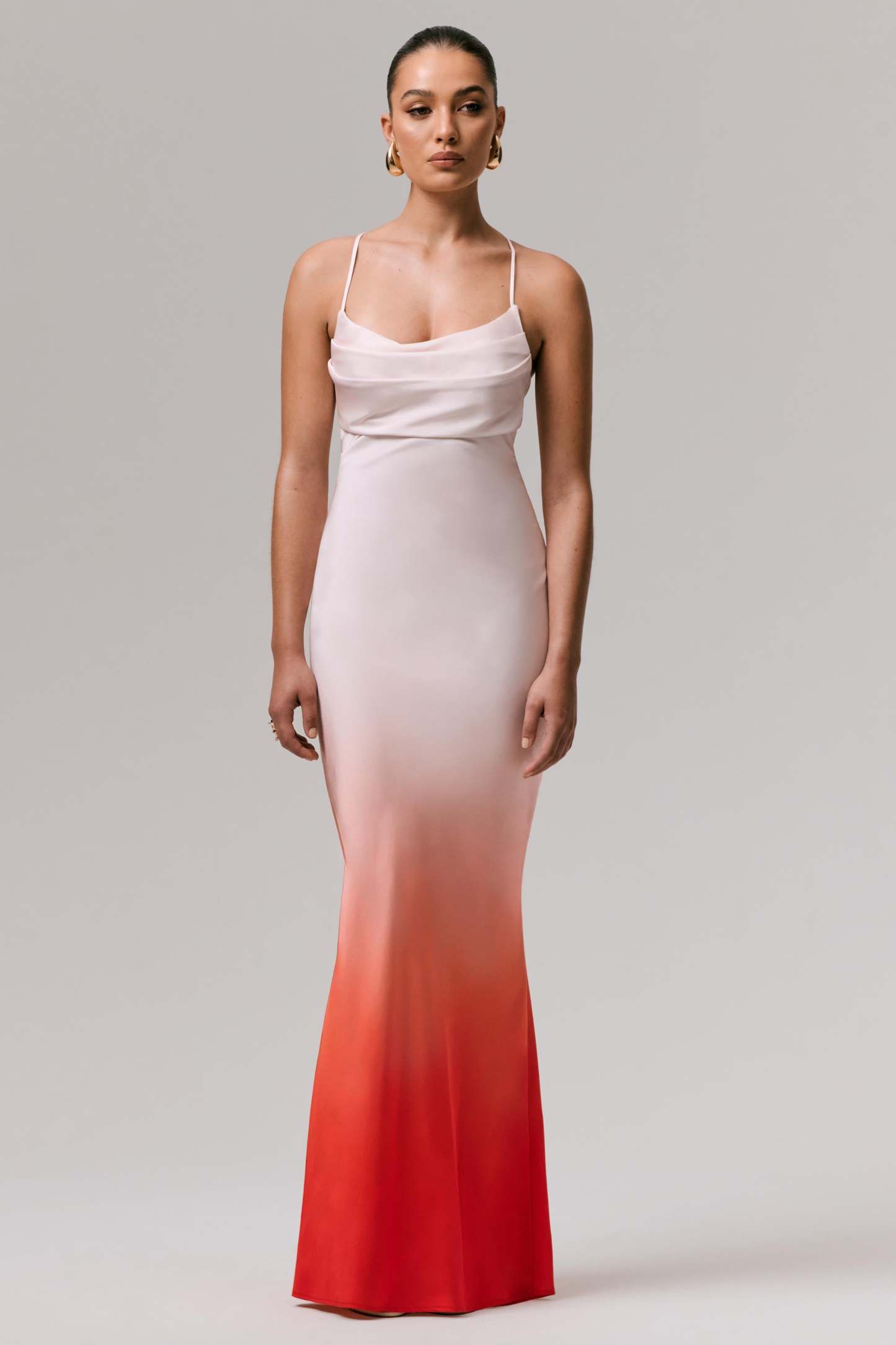 Timeless elegance meets allure in our latest head-turner, Lucie. Crafted in a striking red ombre hue of our premium stretch satin, this maxi dress moves effortlessly whilst defining your silhouette. The draped cowl neckline adds an effortless feel to this show-stopper, whilst elegantly displaying your decolletage. Finished with a head-turning tie up back detail, that drops into a V-shape, providing a perfect fit that cinches your figure to perfection. Dress this style up, for black-tie moments, or pair with sandals and beachy waves for sunset cocktails.