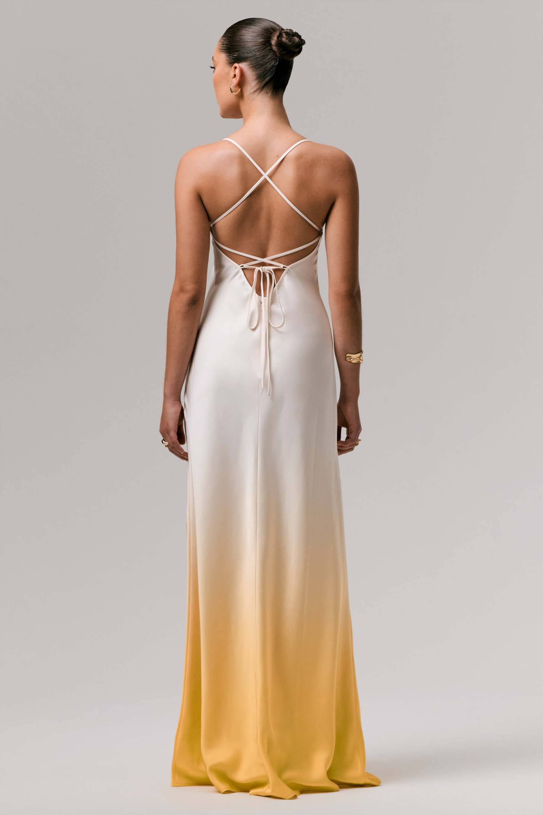 Timeless elegance meets allure in our latest head-turner, Lucie. Crafted in a striking yellow ombre hue of our premium stretch satin, this maxi dress moves effortlessly whilst defining your silhouette. The draped cowl neckline adds an effortless feel to this show-stopper, whilst elegantly displaying your decolletage. Finished with a head-turning tie up back detail, that drops into a V-shape, providing a perfect fit that cinches your figure to perfection. Dress this style up, for black-tie moments, or pair with sandals and beachy waves for sunset cocktails.