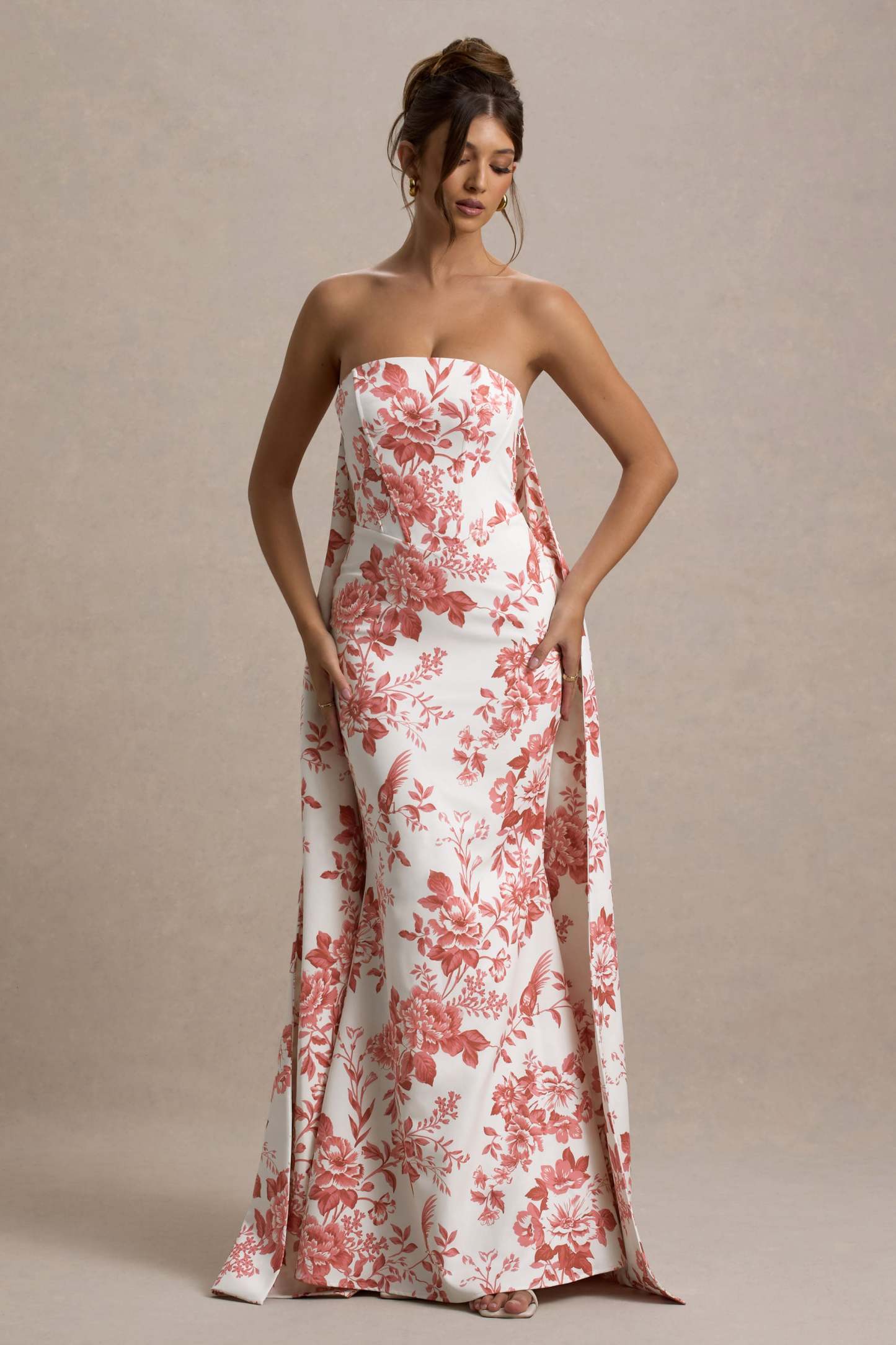Turn heads at every formal affair this season with our latest dramatic maxi Lywenn. Crafted from our premium stretch crepe in a gorgeous pink porcelain print, this exquisite piece features a delicate bandeau neckline and an impressive cape detail. Style yours with delicate accents to let Lywenn shine at your next event.