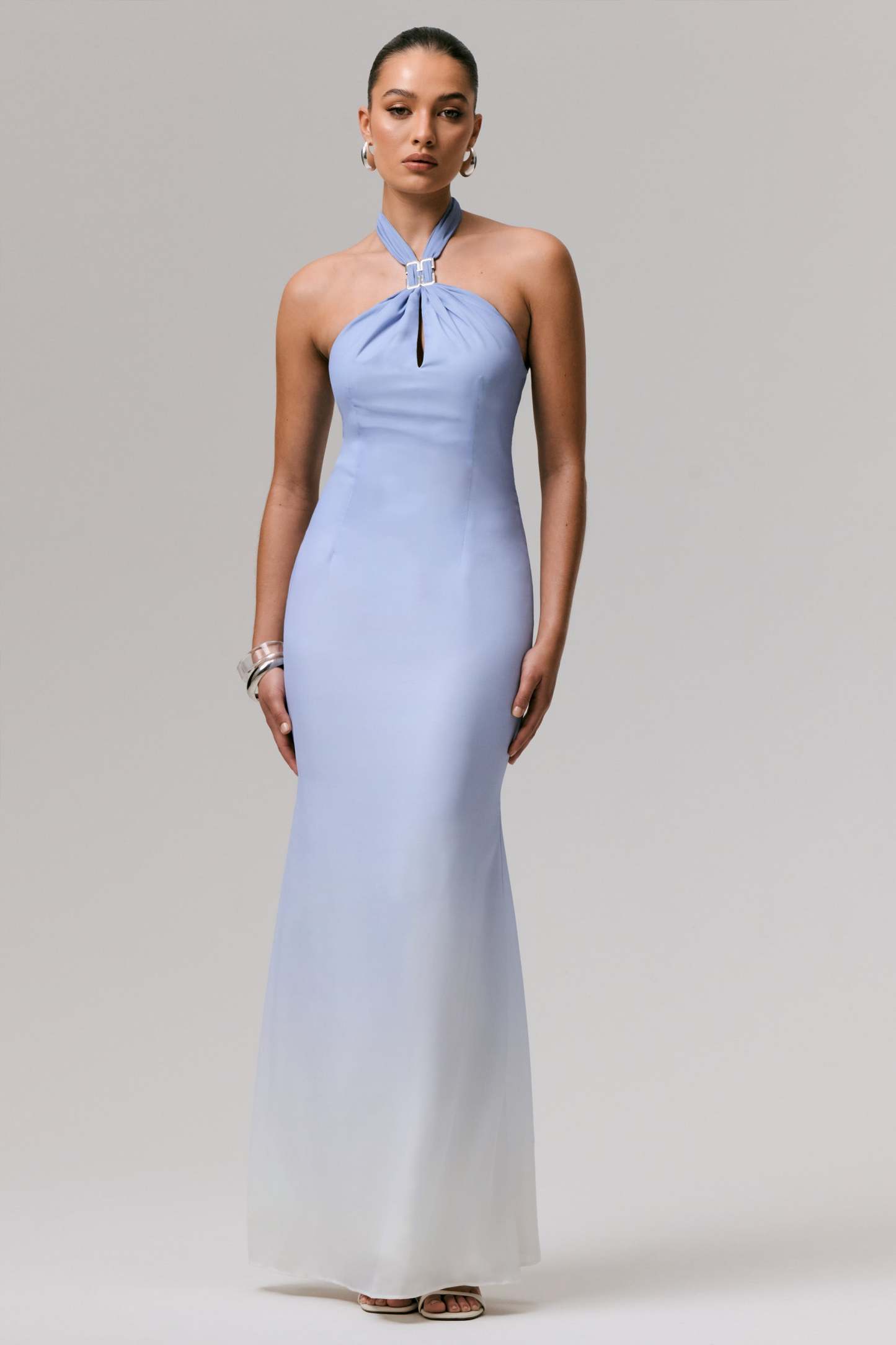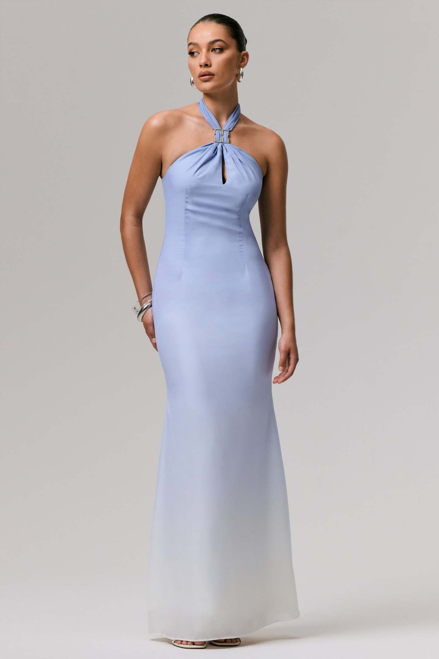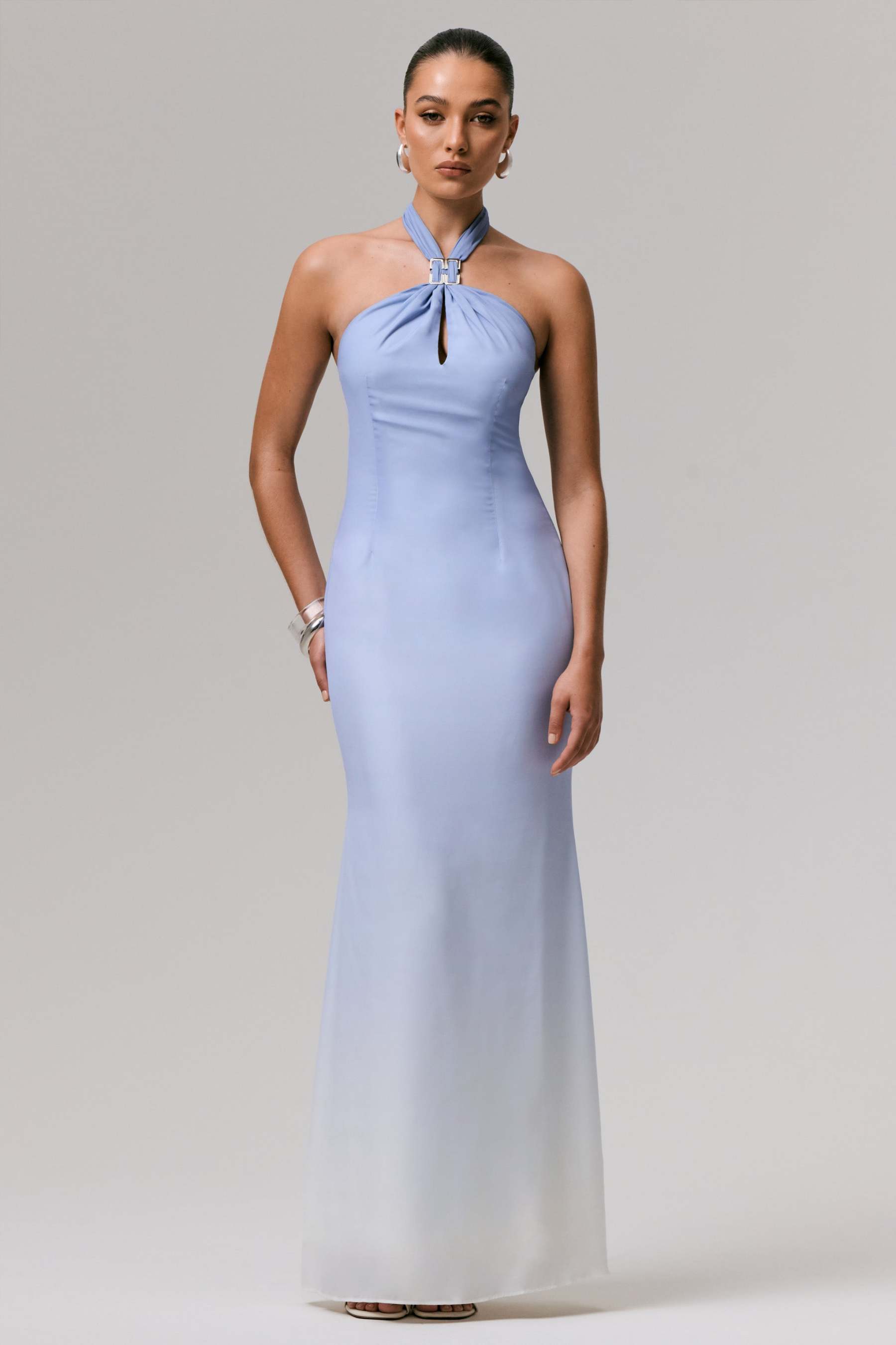 From destination weddings to summer soirees, Sharni will be your go to this season. Curated in our premium chiffon, for an elegant finish, in a soft shade of blue ombre. Featuring a halter neckline, with a striking metal trim and a chest cut-out detail for just the right amount of drama, this piece ensures you won't be forgotten.