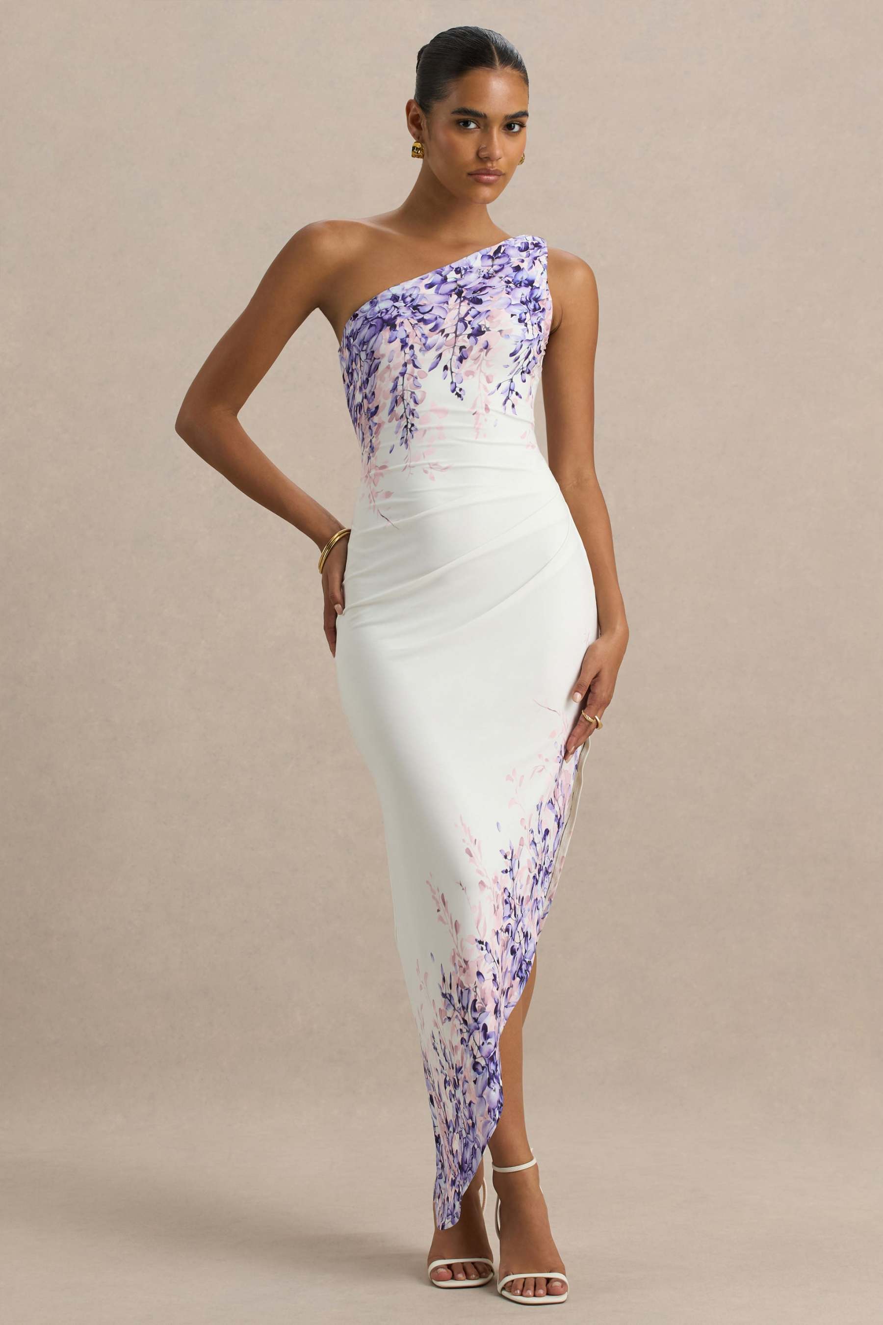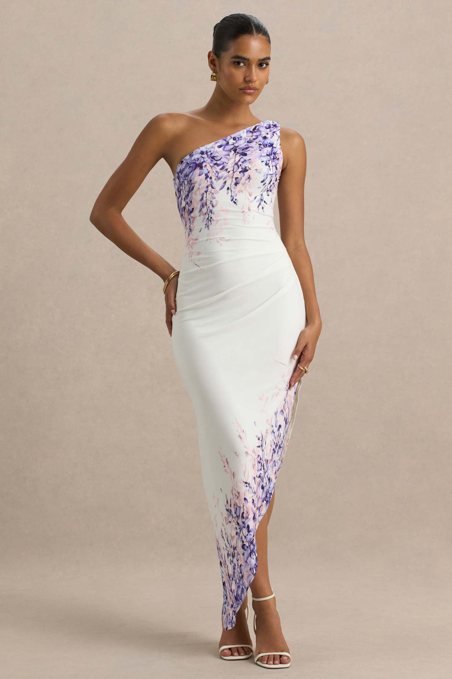 Feminine with a touch of edge, Sybil is the ultimate figure-flattering statement. Cut from our premium stretch jersey in a romantic purple floral print, this midi dress is perfect for making an entrance. Featuring an asymmetric neckline and hemline for a, sculpted silhouette. Completed with ruched detailing that enhances your curves in all the right places, creating a sleek and confident finish. Style Sybil for weddings, garden parties, or sunset cocktails, with delicate jewellery.