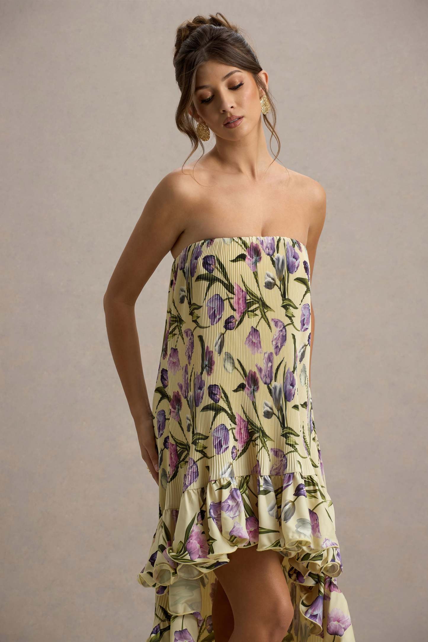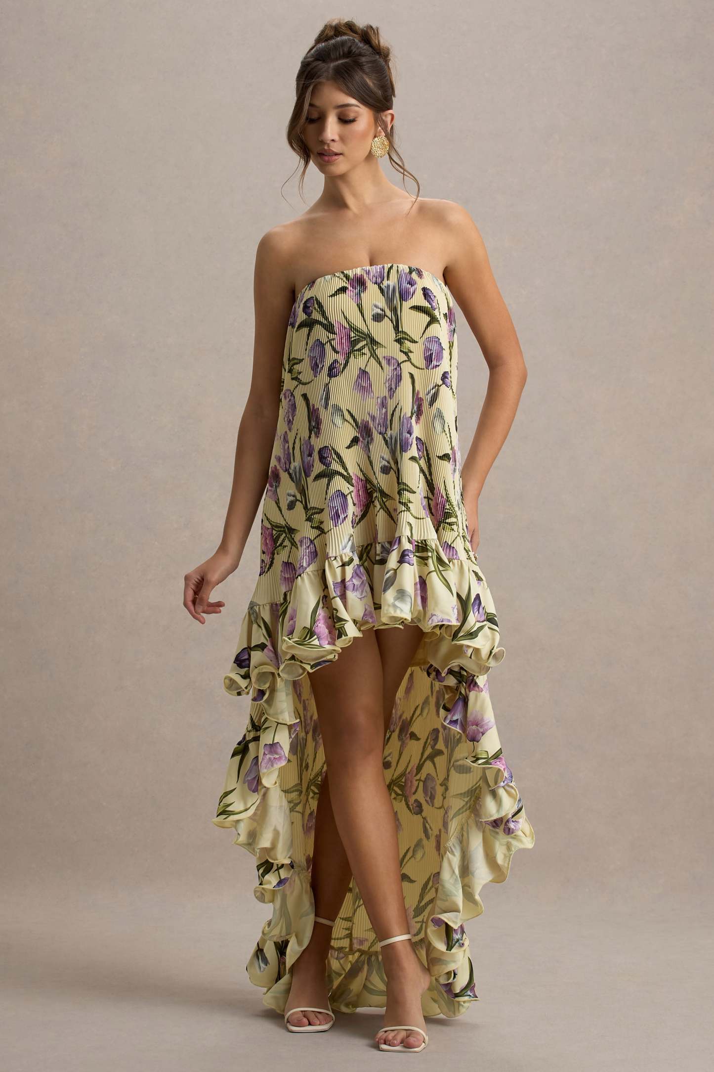 Glamorous and evocative, this ruffled maxi dress is ready to feel that summer swing. Whistler has been crafted in a crisp tulip floral print of our premium pleated chiffon and boasts a bandeau neckline and ethereal high-low hemline. Compliment this strapless piece with a tousled bun this sun season.